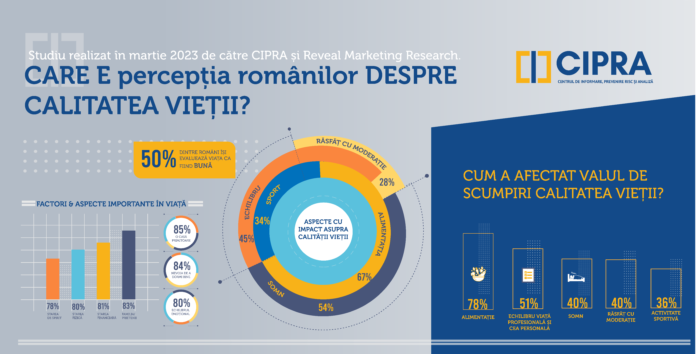 Acest nou studiu este unul complex, adaptat contextului economic delicat pe care îl traversăm și a fost special conceput pentru a evidenția modul în care schimbările din ultimul an au influențat calitatea vieții românilor și preocupările lor pe diverse paliere. Chiar dacă din această cercetare de piață reiese că jumătate dintre respondenți își percep calitatea vieții ca fiind bună, scumpirile semnificative au avut un impact puternic asupra modului în care oamenii își organizează bugetul și prioritățile, dar și asupra modului în care se odihnesc sau își petrec timpul liber. Este îngrijorător faptul că, în 2023, starea de spirit nu mai ocupă un loc la fel de important în topul factorilor considerați esențiali pentru calitatea vieții, iar declarațiile respondenților demonstrează că au avut de suferit în ultimul an aspecte precum gradul de mulțumire față de aspecte cum este odihna – cu 15% mai puțini respondenți sunt mulțumiți de modul în care dorm, iar satisfacția față de alimentele pe care le consumă este cu 14% mai mică în 2023. Tot în scădere este mulțumirea față de aspecte precum echilibrul dintre viața personală și cea profesională sau timpul petrecut pentru relaxare“, spune Constantin Bratu, Președinte CIPRA.
