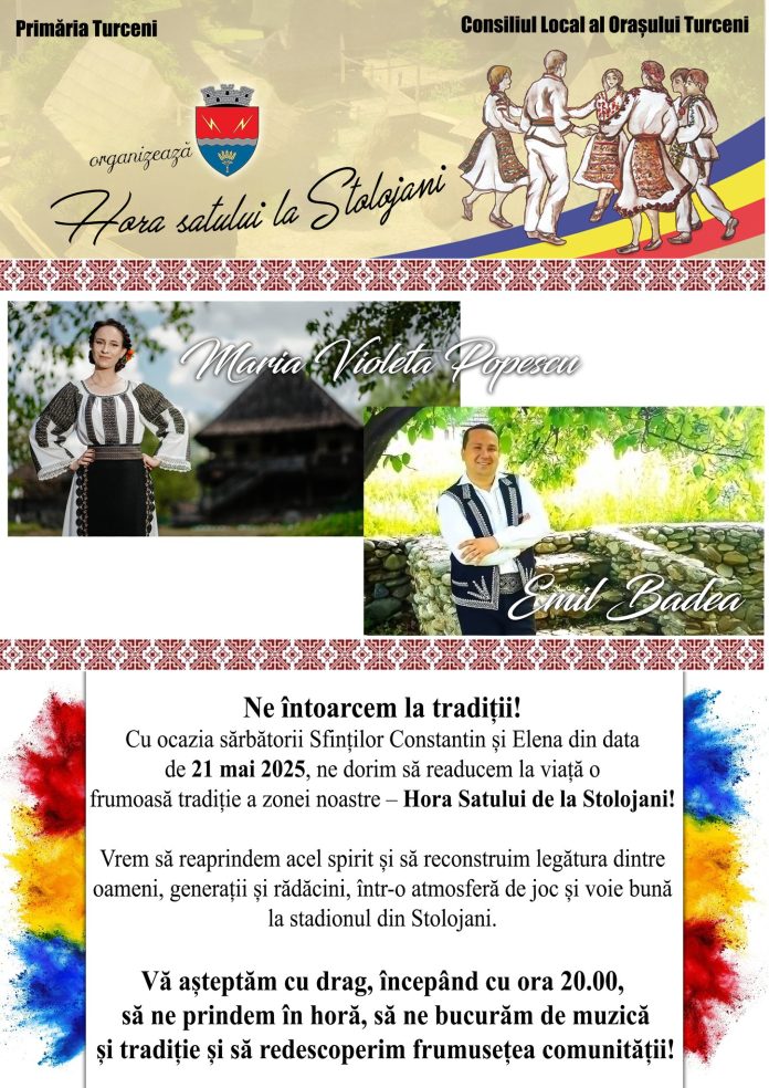 Primăria Turceni și Consiliul Local al Orașului Turceni anunță organizarea evenimentului Hora Satului la Stolojani, care va avea loc miercuri, 21 mai 2025, cu prilejul sărbătorii Sfinților Constantin și Elena.