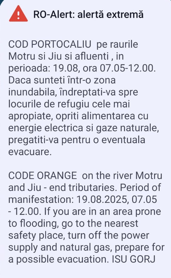 Avertizarea a fost transmisă prin sistemul RO-Alert, atât în limba română, cât și în limba engleză, pentru a informa rapid cetățenii din zona vizată.