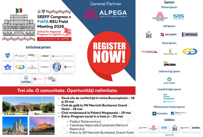 În perioada 18 – 20 mai 2026, Bucureștiul găzduiește unul dintre cele mai importante evenimente ale anului pentru sectorul transporturilor, expedițiilor de mărfuri și logisticii: Congresul European al Caselor de Expediții (SEEFF x FIATA REU Field Meeting 2026).