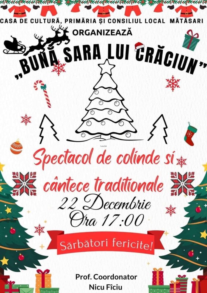 Vineri, 22 decembrie, la Casa de Cultură Mătăsari, sunteți așteptați la un spectacol de colinde și cântece tradiționale, începând cu ora 17:00.